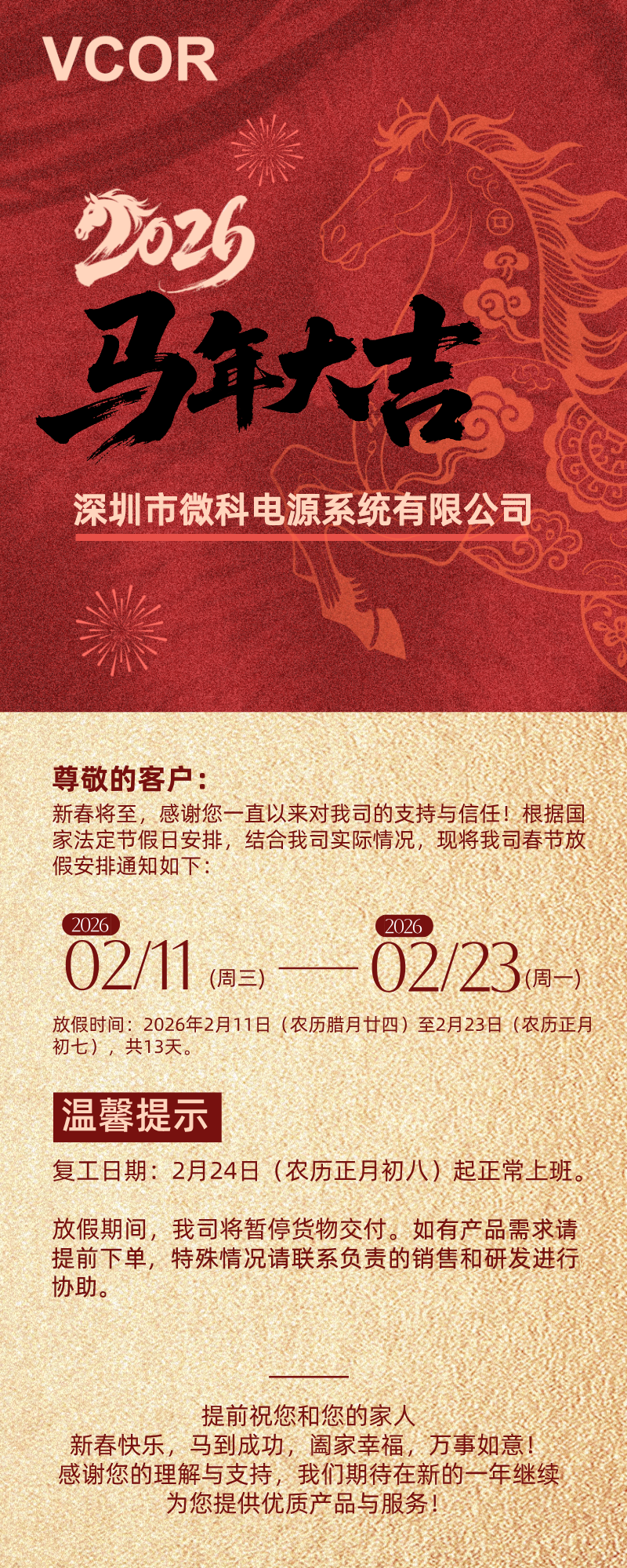 新春佳节将至,深圳市微科电源系统有限公司谨向您致以最诚挚的节日问候,衷心感谢您一直以来对我司的支持、信任与紧密协作!结合国家法定节假日安排及我司实际情况,现将2026年春节放假相关事宜通知如下,敬请您知悉并提前规划相关事宜。